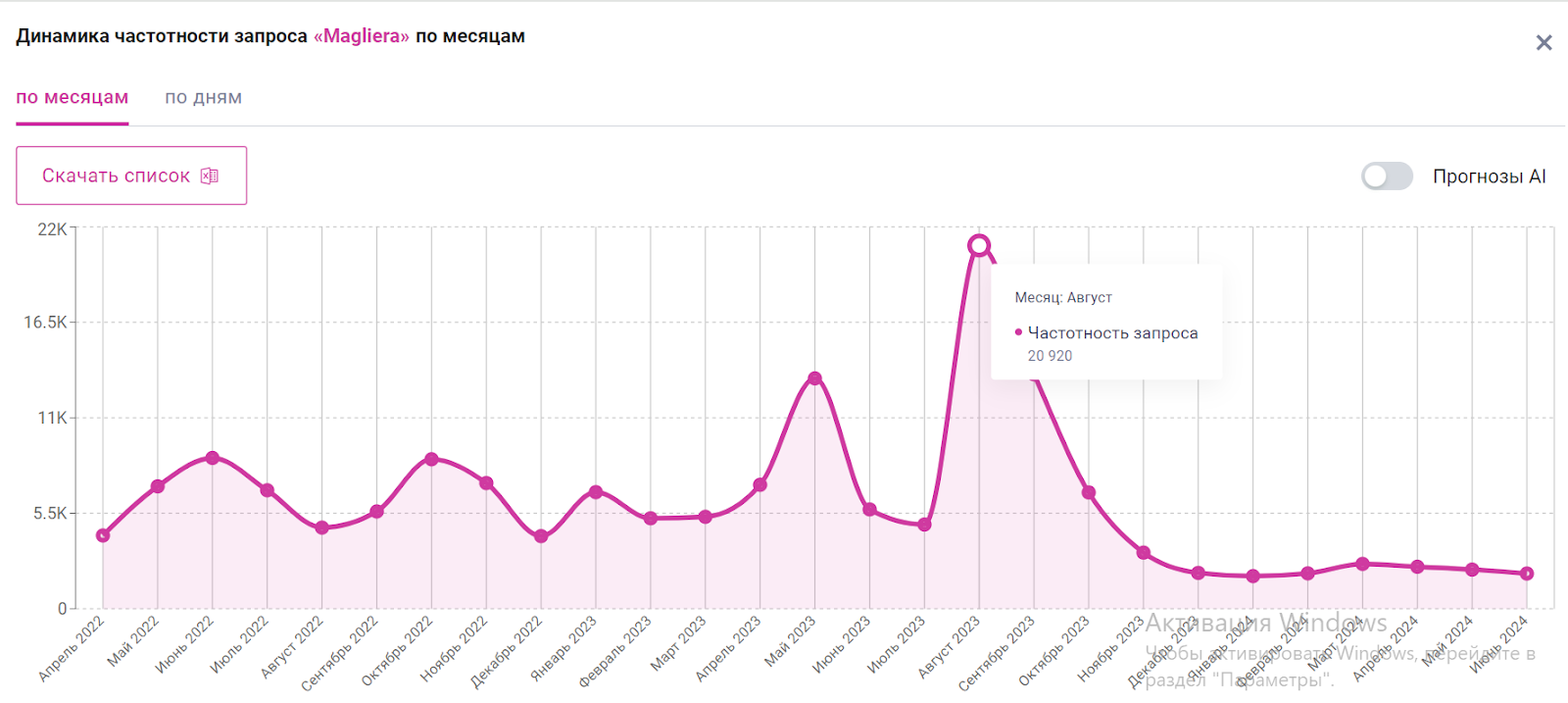 Прекрасная основательница бренда одежды тоже вовремя поняла, что главный актив компании —бренд, и зарабатывает 25 104 000 рублей дополнительно каждый месяц только за счет того, что почти 21 000 человек ищет и покупает именно ее бренд органически: